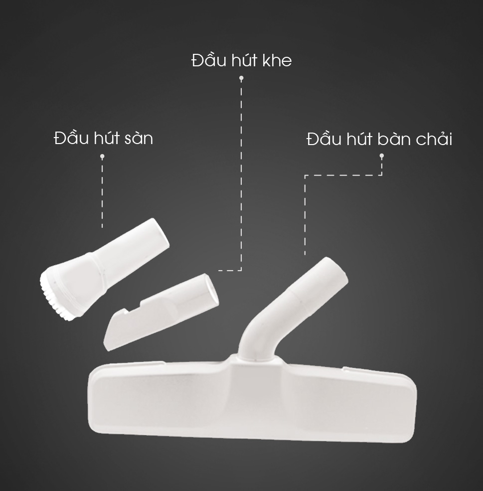 Phụ kiện đầu hút đi kèm: đầu hút sàn, đầu hút khe, đầu hút bàn chải