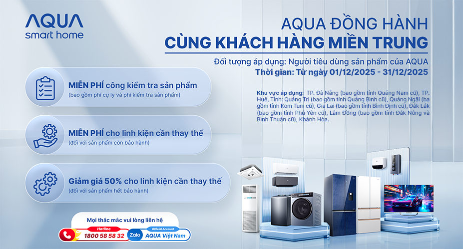 • Thông tin cần được đăng ký qua ZALO AQUA, website AQUA Việt Nam https://aquavietnam.com.vn hoặc tổng đài 1800585832 trong thời gian áp dụng chương trình và Quý Khách hàng vui lòng thông báo với tổng đài viên nội dung “Đăng ký chương trình hỗ trợ khách hàng miền Trung sau lũ lụt” để phân biệt với các thông tin bảo hành thông thường.